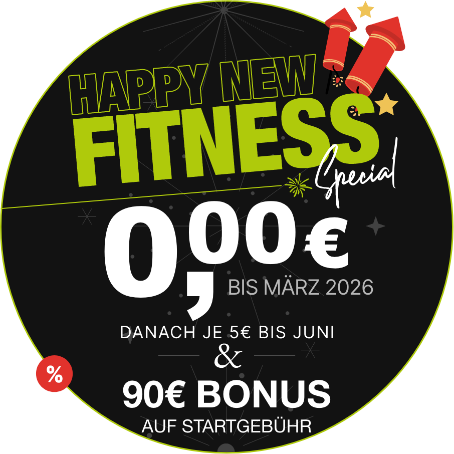 Wir möchten Dich mit unserem Neujahrs-Special fit machen für den Start in 2026. Deswegen bekommst Du mit unseren „Happy New Fitness“ Tarifen, dein ganz persönliches Neujahrsgeschenk von uns.